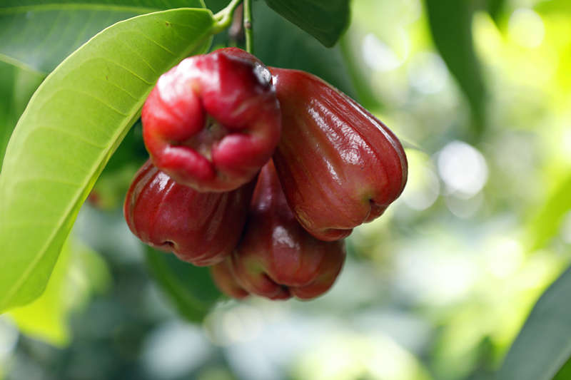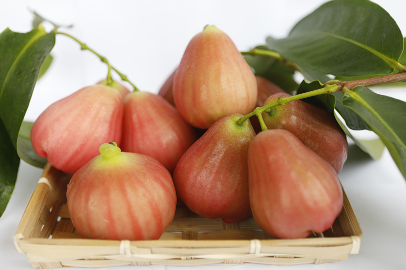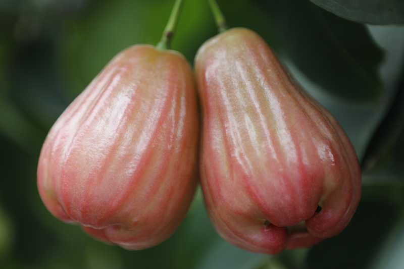 ? ? ? ?蓮霧又名洋蒲桃、紫蒲桃、水蒲桃、水石榴、天桃、輦霧、爪哇浦桃、璉霧,桃金娘科,原產(chǎn)印度、馬來西亞,尤以爪哇種植的最為聞名,故又有“爪哇蒲桃”之稱。在海南蓮霧被稱為“點不”,也稱為“撲通”,由于時常從樹上掉下來撲通一聲響,有些海南人只了解“點不”,卻不曉得蓮霧為何物,在廣東它也被稱做“棉花果”,潮汕地區(qū)稱為“蓮霧“。臺灣的蓮霧是17世紀由荷蘭人引進臺灣,臺灣屏東是最著名的產(chǎn)地,是一種重要生長于熱帶的生果。跟著科學(xué)昌明,蓮霧除了原來的赤色以及綠色之外,另有新品種的暗紅色蓮霧。在馬來西亞稱為“水翁”,馬來西亞人一樣平常是切開后沾酸梅粉吃。